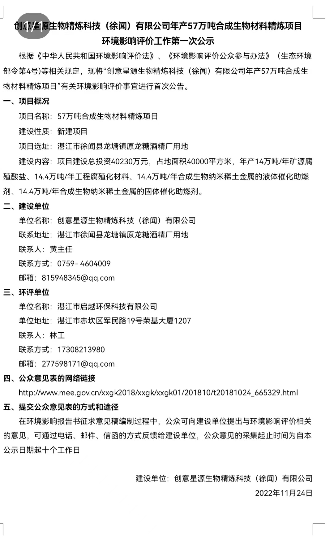 創(chuàng)意星源(徐聞)合成生物材料精煉項目環(huán)評公示